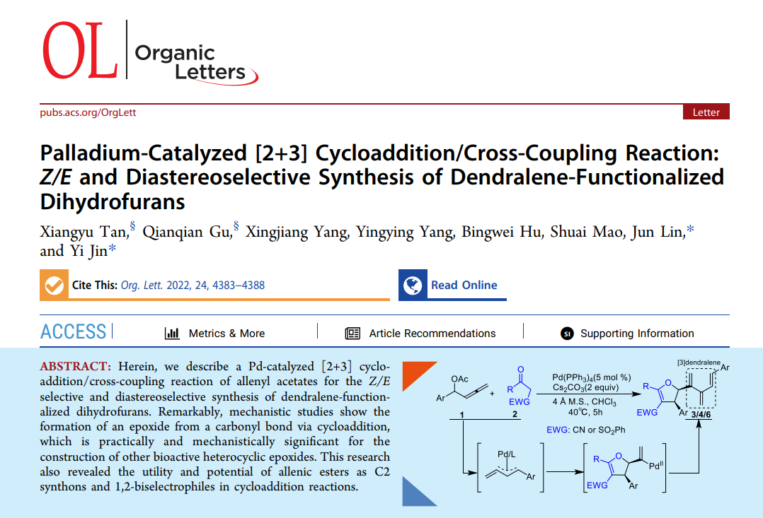Herein, we describe a Pd-catalyzed [2+3] cycloaddition/cross-coupling reaction of allenyl acetates for the Z/E selective and diastereoselective synthesis of dendralene-functionalized dihydrofurans. Remarkably, mechanistic studies show the formation of an epoxide from a carbonyl bond via cycloaddition, which is practically and mechanistically significant for the construction of other bioactive heterocyclic epoxides. This research also revealed the utility and potential of allenic esters as C2 synthons and 1,2-biselectrophiles in cycloaddition reactions.