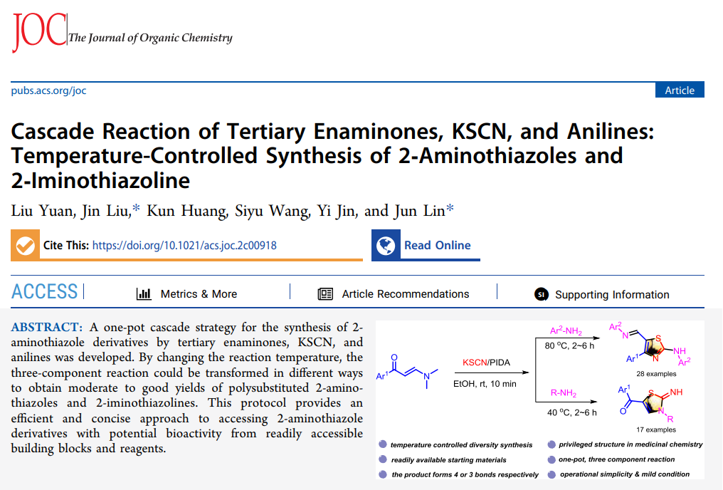 A one-pot cascade strategy for the synthesis of 2-aminothiazole derivatives by tertiary enaminones, KSCN, and anilines was developed. By changing the reaction temperature, the three-component reaction could be transformed in different ways to obtain moderate to good yields of polysubstituted 2-aminothiazoles and 2-iminothiazolines. This protocol provides an efficient and concise approach to accessing 2-aminothiazole derivatives with potential bioactivity from readily accessible building blocks and reagents.